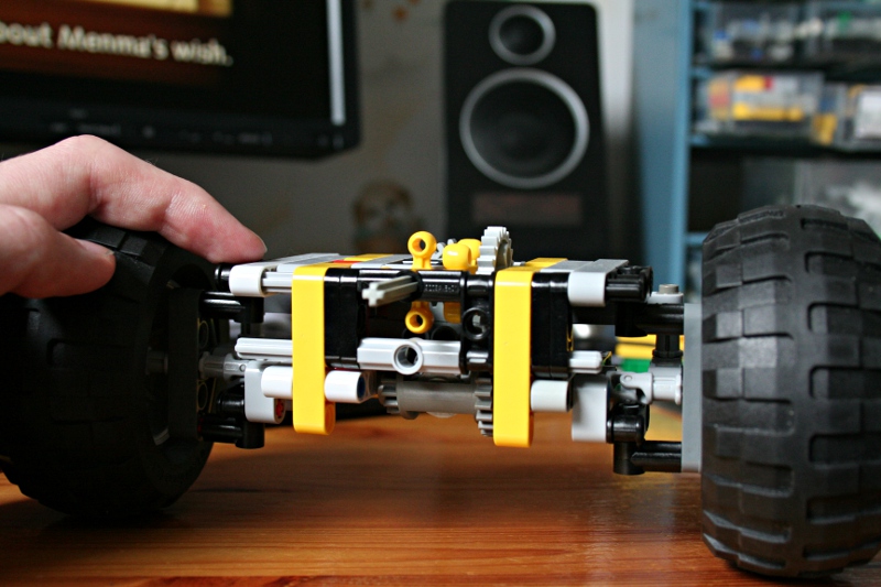 Since I do not need to provide steering for middle axles the axle does not go all the way through. It stops and is continued on the other side with the axle from the steering. I did the steering pretty much like Sariel, just with an normal 16 tooth gear instead. Whether if I use the gear or axle for steering I do not know yet though.