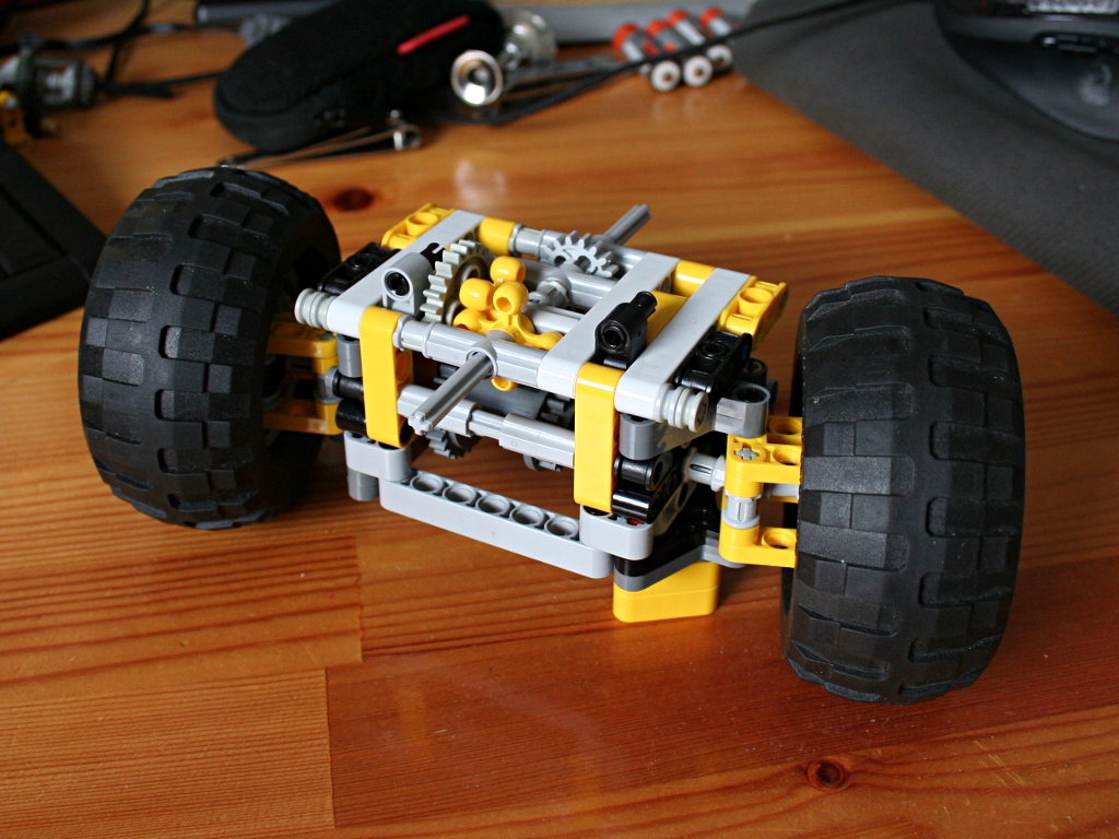 I would like to attempt to place the motors underneath the drive axle like this: It might be a bit difficult to keep the length down, avoid it being in the way of the wheels when they turn and keep the gear train sufficiently strong at the same time. But if it succeeds the motors are nicely hidden away and will not get in the way of the steering axle.
