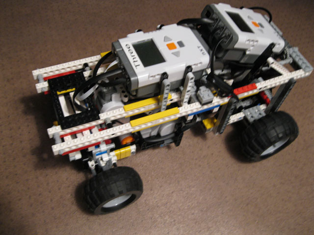 It is remote controlled using the PSP-Nx and a playstation 2 wireless controller. I used RS485 for the "master" (front NXT) to tell the slave what to do. The master controls the front drive motors and the steering motor (it uses APR for the steering