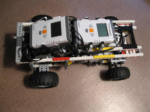 It is remote controlled using the PSP-Nx and a playstation 2 wireless controller. I used RS485 for the "master" (front NXT) to tell the slave what to do. The master controls the front drive motors and the steering motor (it uses APR for the steering 8-)). The slave controls the two rear drive motors, and the differential locking motor. I implemented my ramp up/down motor control for "smooth" driving (I have control over the ramp rate with the controller).